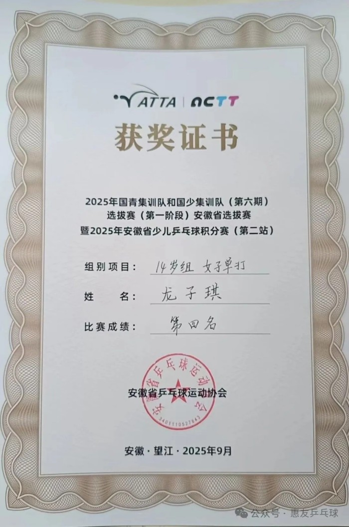 14 years old group women's singles fourth (Long Ziqi)
